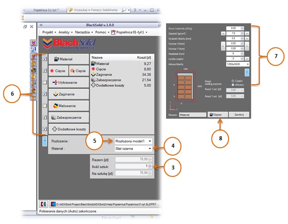 Na każdym etapie pracy z dodatkiem BlachSolid możesz zmieniać wartości kontrolek kalkulatorów, co spowoduje przeliczenie składowych kosztu.