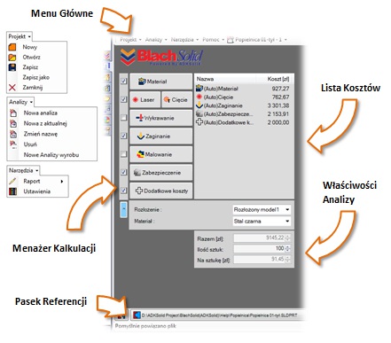 Menu Główne - zawiera główne polecenia BlachSolid dotyczące Projektu, Analizy kosztowej, Narzędzi oraz Pomocy. W jego skład wchodzą: Menu Projekt, Menu Analizy, Menu Narzędzia oraz Menu Pomoc.