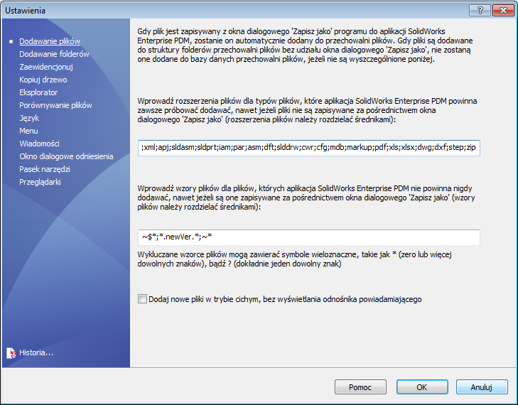01Jeżeli zapisujesz plik z okna dialogowego „Zapisz jako” do aplikacji EPDM, zostanie on automatycznie dodany do przechowalni plików. Jeżeli jednak pliki są dodawane do struktury folderów za pomocą makra, nie zostaną one dodane do bazy danych przechowalni plików. Musisz wprowadzić w opcjach Ustawienia->Dodawanie plików odpowiednie rozszerzenia plików dla typów plików, które aplikacja SOLIDWORKS® Enterprise PDM powinna automatycznie dodawać. W MacroSolid znajdziesz makra do generowania list materiałowych do pliku Excel® oraz Word®, jak i makra generujące pliki będące dokumentacją projektu m.in. *.dxf (makro DXF), *.step i *.x_t (makro STEP) oraz *.pdf i *.dxf z rysunku 2D (makro DRW->PDF/DXF). W ustawieniach aplikacji EPDM musisz dodać rozszerzenia tych plików rozdzielone średnikiem (;pdf;doc;docx;xls;xlsx;dwg;dxf;step;x_t ).