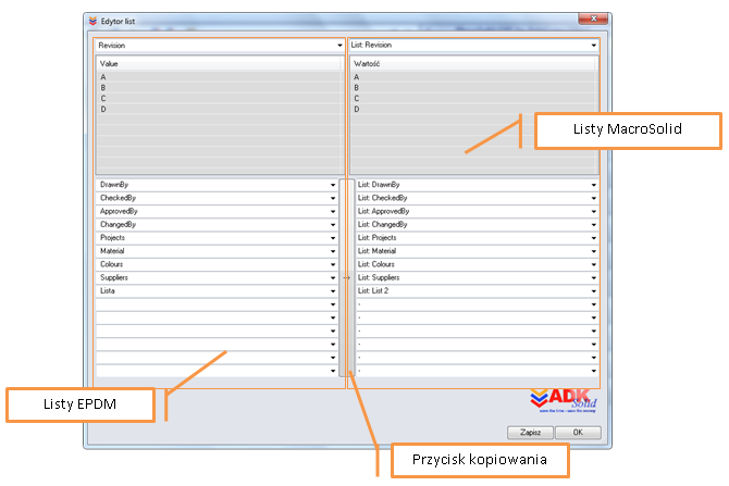 Opracowaliśmy funkcję PDMLogUserName oraz możliwość czytania list tj. zdefiniowanych wartości kart właściwości EPDM, dzięki czemu jednym kliknięciem możesz przekopiować listy EPDM do list MacroSolid.