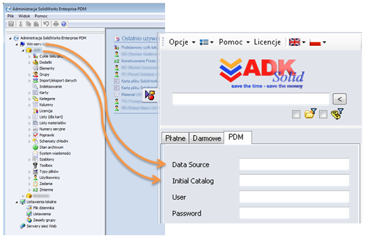 04MacroSolid umożliwia czytanie list EPDM – kart zdefiniowanych wartości właściwości plików, dzięki czemu jednym kliknięciem możesz ustawić - zsynchronizować listy wykorzystywane w MacroSolid z listami EPDM. Czytanie list EPDM zadziała jeżeli w zakładce PDM MacroSolid zostaną wpisane dane połączenia z bazą danych EPDM (patrz poniżej).